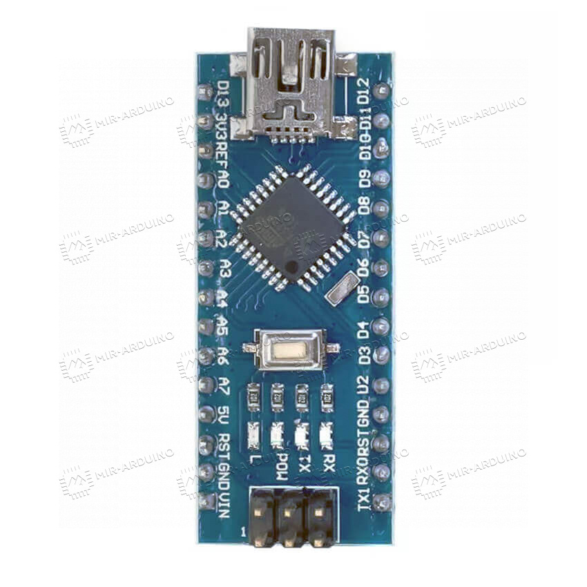 Arduino NANO – самый миниатюрный микроконтроллер семейства Ардуино. Плата работает на базе чипа ATmega328. Легко интегрируется в сложные схемы, обеспечивает высокие рабочие характеристики при минимальных габаритах. Размеры контроллера – 1.85 см x 4.2 см. Плата оснащена 14 цифровыми и 8 аналоговыми входами. Данные передаются по интерфейсам UART, I2C и SPI. Для синхронизации с компьютером предусмотрен разъем под кабель мини USB.