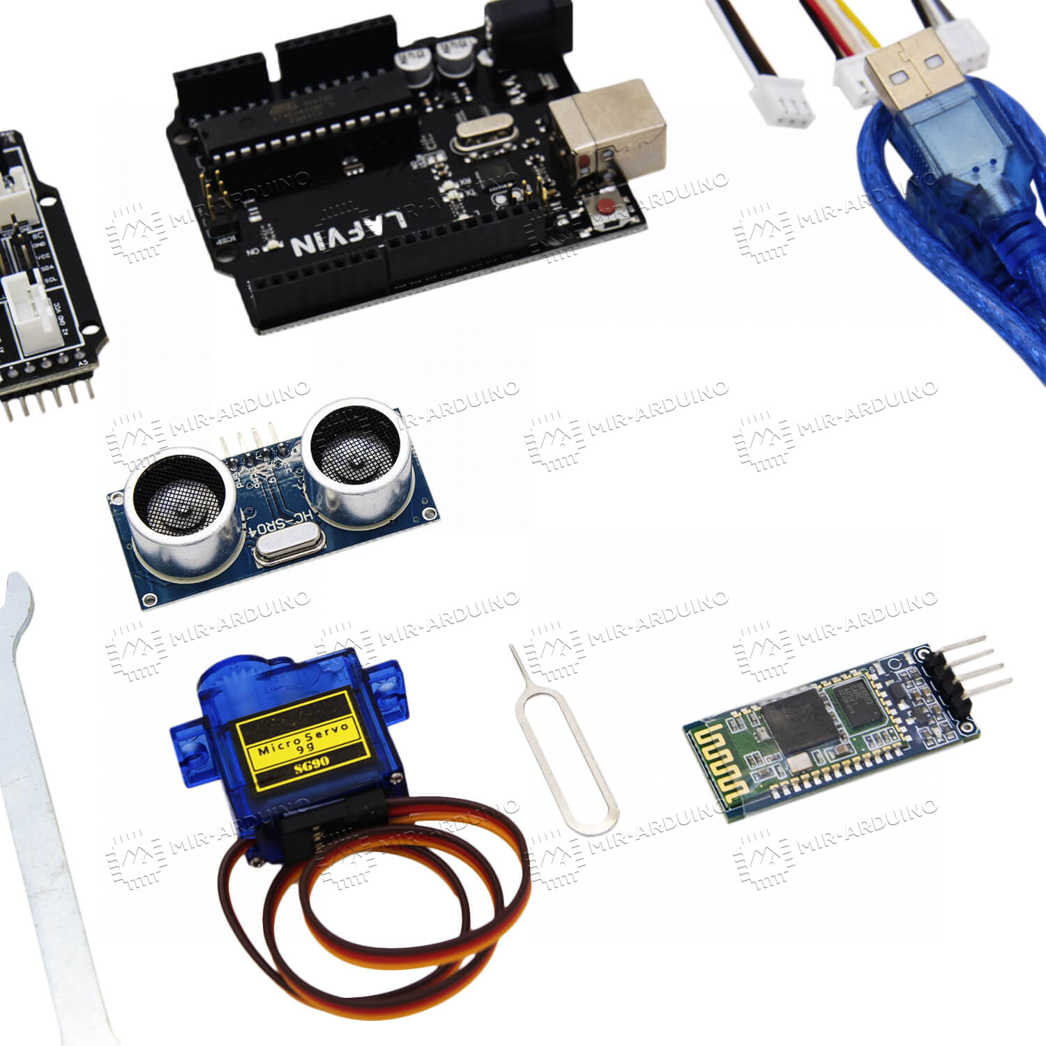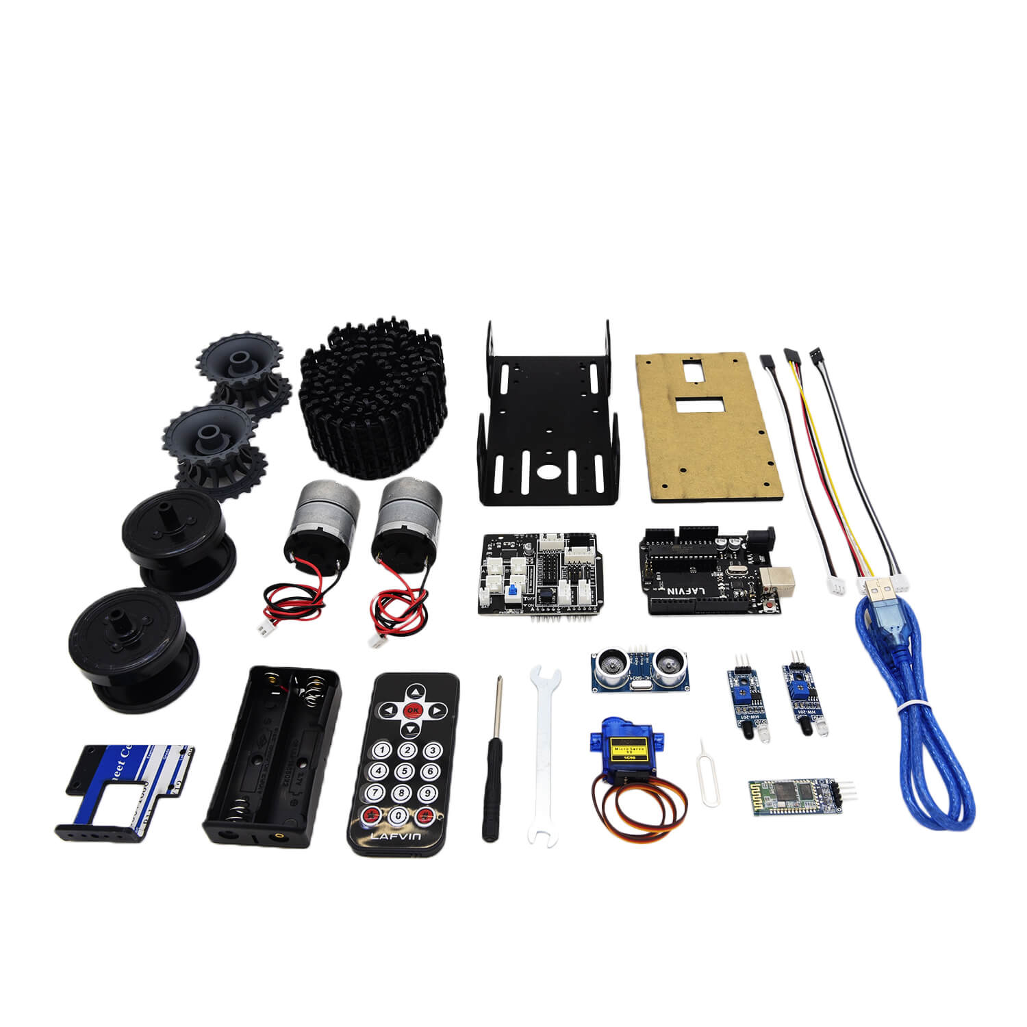 Набор для моделирования Ардуино (Arduino) Tank Robot Lafvin – умный конструктор для проектирования робота-танка. Комплект не требует использования паяльника, подойдет для детей и начинающих робототехников. Собранный робот будет передвигаться по заданной траектории, объезжать препятствия. Управлять танком можно с телефона, для синхронизации используется Bluetooth модуль. Набор включает в себя элементы корпуса робота, двигатель, датчики, провода, аккумулятор, пульт управления, зарядный кабель.